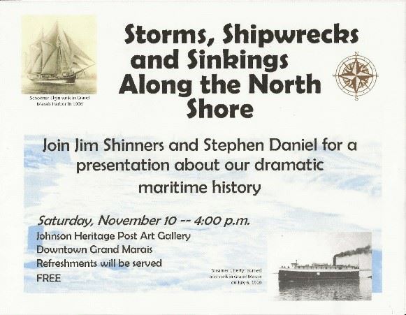 Carrie McHugh, executive director of the Cook County Historical Society asked Steve to speak about the shipwrecks in Grand Marais. This was to be part of the Storm Fest program that the City of Grand Marais was conducting through a number of events over the November 9–11, 2018 weekend. He agreed and would be part of a two person presentation with another local speaker, Jim Shinners. Jim spoke about the Siskiwit, another shipwreck that had been lost in Lake Superior off Grand Marais. The two speakers were portrayed on posters entitled Storms, Shipwrecks and Sinking's Along the North Shore, which were displayed around the city.